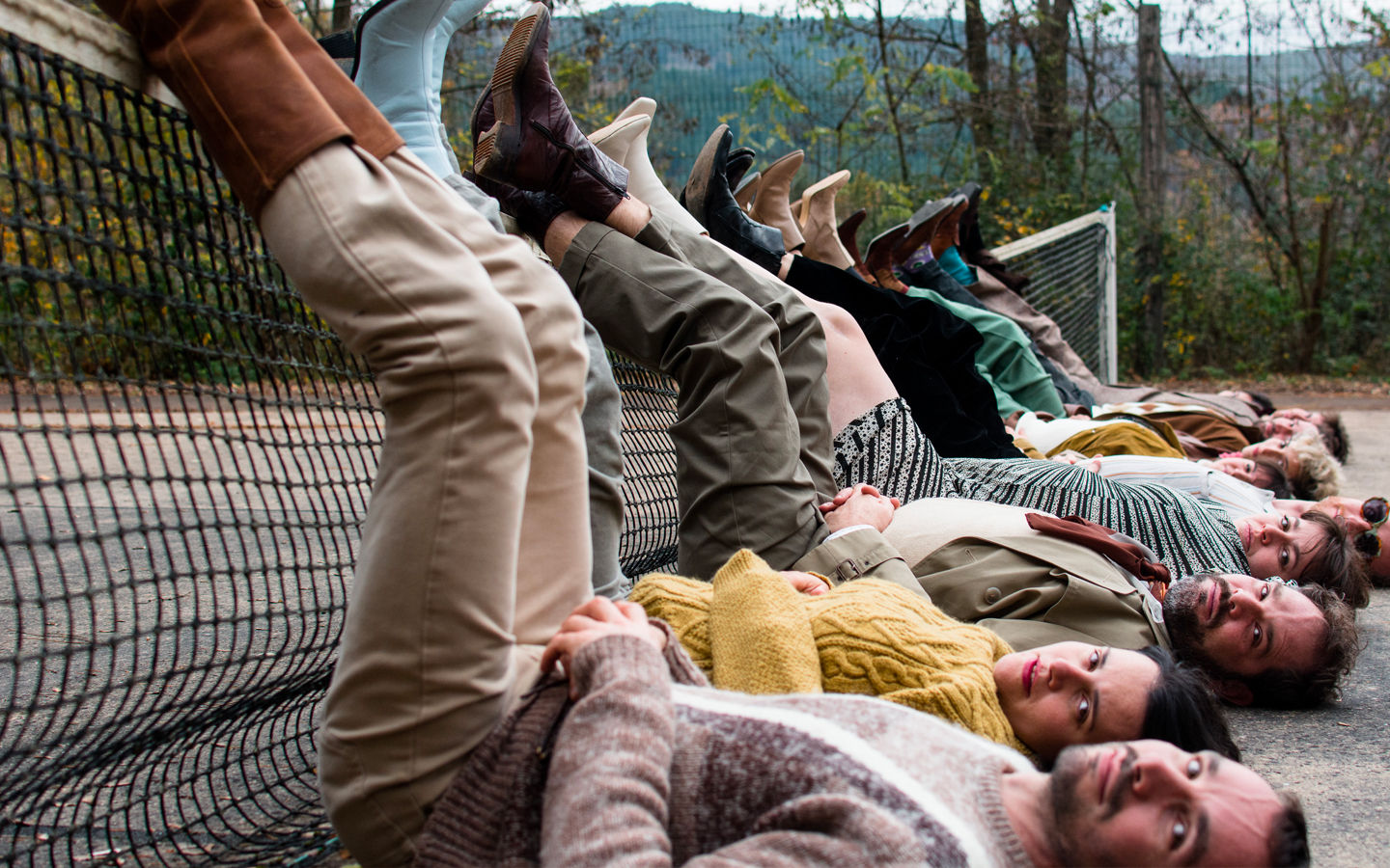 Nous sommes plus d’une vingtaine de performeur.euse.s, réuni.e.s par l’envie de transformer nos relations aux espaces de vie. Principalement issu.e.s du monde du théâtre, nous avons eu le désir de travailler en dehors des salles dédiées à la représentation, et avons fait des lieux du quotidien nos terrains de jeu. Le dispositif de départ de nos performances est simple : des corps interprétant l’espace.